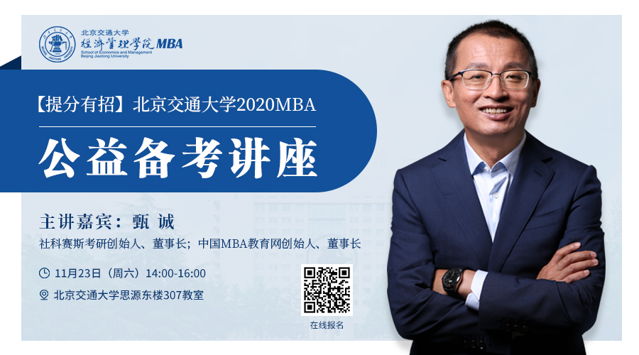 距離2020MBA聯(lián)考僅剩不足37天,你的復習進行到哪一步了?準備好最后的沖刺了嗎?如何讓自己更加自信地踏入考場?為了幫助2020級考生輕松應對考試,北京交通大學MBA教育中心特邀社科賽斯考研創(chuàng)始人、董事長,中國MBA教育網(wǎng)創(chuàng)始人、董事長甄誠先生帶領考生解密MBA的備考之旅。歡迎廣大備考生參與!