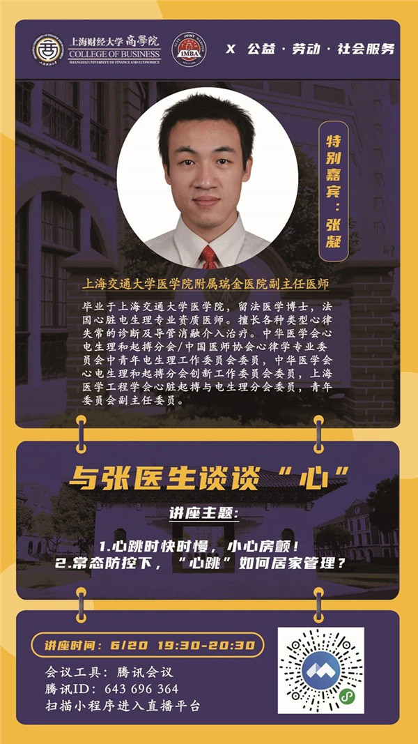除了工作、學習、生活、保養(yǎng)自我健康、關懷家人健康、為社會廣大群眾提供服務,是“公益·勞動·社會服務”講座舉辦的初衷。本期,由上財iMBA校友特別邀請到上海交通大學醫(yī)學院附屬瑞金醫(yī)院副主任醫(yī)師張凝醫(yī)生,做客線上直播室,與我們的同學和家人談談“心”,為大家答疑解惑,分享居家健康管理知識。同時,張凝醫(yī)生也是一位特別有故事的人,在繁忙的工作之余,他樂于與更多人分享專業(yè)知識和人生感悟,相信我們的同學和家人們都能在這一次特別的交流中有所收獲。歡迎同學、校友、家屬、社會各界朋友們一同相約6月20日線上直播間。