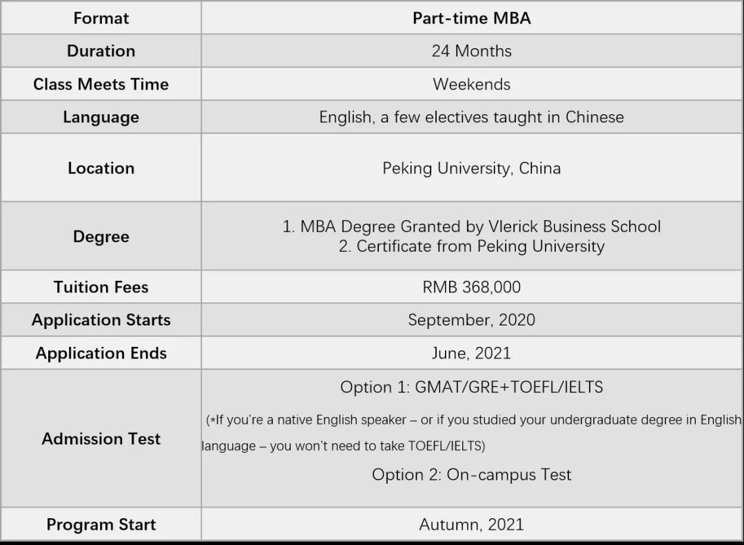 Through systematic world-standard MBA education, Peking University - Vlerick Business School MBA aims to nurture a group of executives with a mastery of the theories and practices of international business and build a group of leaders with knowledge, vision and entrepreneurship. The curriculum focuses on developing students' core management skills, applying the advanced management theory in Chinese practices and having a variety of skills in different areas.