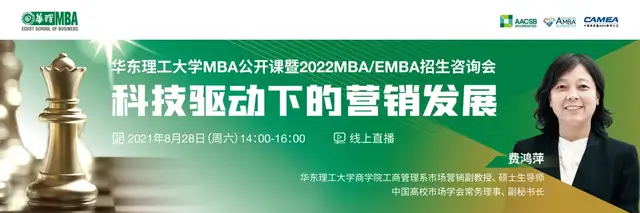 8月28日,華東理工大學(xué)2022MBA/EMBA招生咨詢會將為大家?guī)砭使_課《科技驅(qū)動下的營銷發(fā)展》,聊聊新時代下企業(yè)營銷的那些事。屆時,歡迎大家走進直播間,你將有機會摸清營銷套路,獲取最全干貨信息。