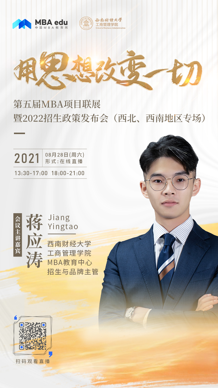同時,為積極響應國家倡議,做好暑假期間疫情安全防控——中國MBA教育網將采用線上直播的方式,8月28日,西南財經大學工商管理學院MBA教育中心招生與品牌主管蔣應濤老師應邀參加第五屆MBA項目聯展暨2022在線招生政策發(fā)布會(西北、西南地區(qū)專場)”,助力考生在抗“疫”行動中,提前了解院校招生動態(tài)、項目特色、報考與錄取等相關信息,歡迎廣大考生報名,線上咨詢西南財經大學MBA項目。