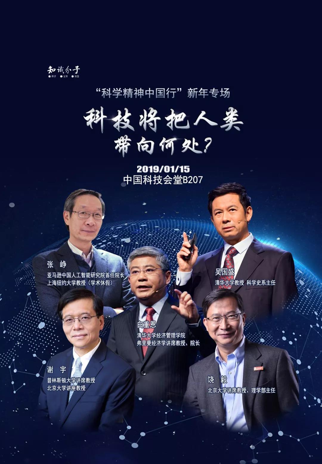 活動簡介 1919年1月15日, 陳獨秀在《新青年》雜志上發(fā)表文章, 號召擁護(hù)德莫克拉西(Democracy)和賽因斯(Science)兩位先生。 “德先生”與“賽先生”的形象第一次出現(xiàn)在國人視野。 距今,我們同兩位先生相識 已過去整整一百年。 100多年前, 西風(fēng)東漸,中國先進(jìn)知識分子投身“啟蒙與救亡”的歷史洪流, 從“科學(xué)救國”到“開啟民智”, “賽先生”在中國的形象不斷演變。 60年前, 共和國吹響“向科學(xué)進(jìn)軍”的號角, 經(jīng)歷十年浩劫, “科學(xué)的春天”徐徐展開。 40年前, 改革開放打開國門, “科學(xué)技術(shù)是第一生產(chǎn)力”論斷斬釘截鐵。 新世紀(jì)以來, 知識創(chuàng)新蓬蓬勃勃, 中國科學(xué)逐漸走向世界科學(xué)的第一方陣, 創(chuàng)新正成為引領(lǐng)發(fā)展的第一動力。 新的科技革命前夜, 未來科技發(fā)展趨勢將會把人類帶向何方? 2019年1月15日, 《知識分子》邀請 五位頂尖科學(xué)家與經(jīng)濟(jì)社會學(xué)者, 在賽先生迎來新的百年之際, 叩響人類社會的未來之門。