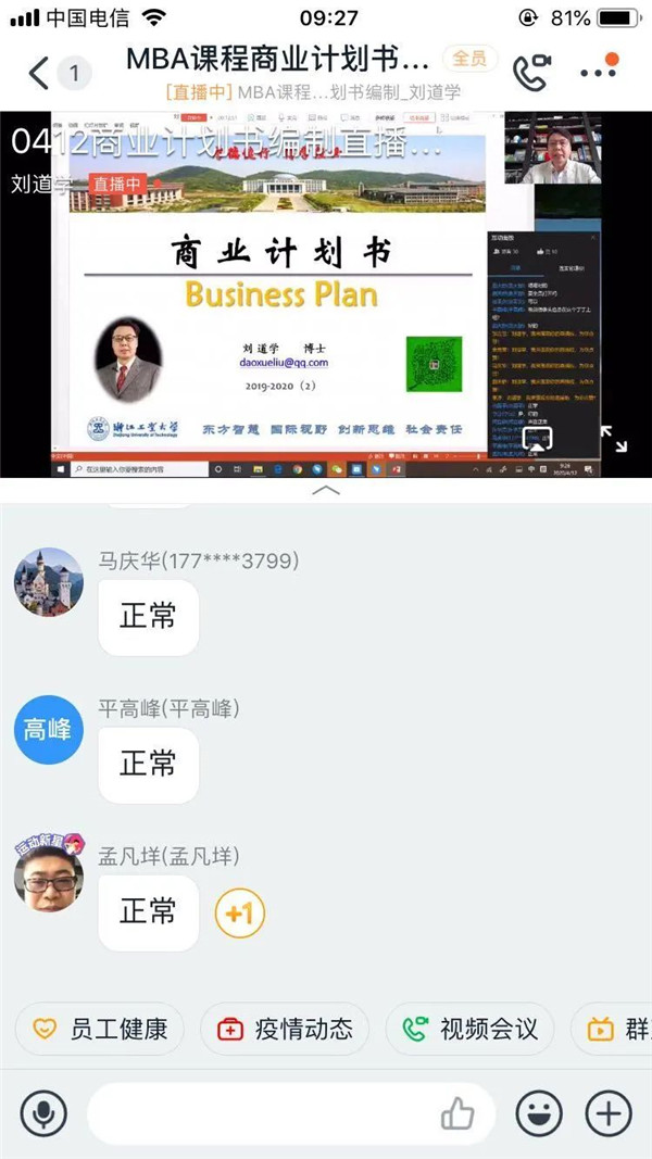 浙江工業(yè)大學MBA課程以案例教學為主,對課堂的互動要求非常高。從面授形式轉為云端授課無疑是一項巨大的挑戰(zhàn)。為了確保課堂效果,教師團隊對各類線上教學平臺進行了探索比較,模擬授課場景,確定授課平臺。在如何加強師生互動的問題上,教師團隊們更是制定了多套方案,進行全面測試,最終擬訂“直播搭配視頻會議”的組合模式。盡可能地還原案例教學中的討論討論環(huán)節(jié)。