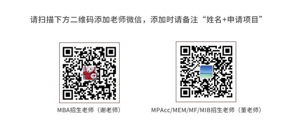 調劑申請條件 1、考生參加2020年全國管理類聯(lián)考第一志愿報考其他院校: 工商管理碩士MBA(125100) 公共管理碩士MPA(125200) 會計碩士 MPAcc(125300) 旅游管理碩士MTA(125400) 圖書情報碩士MLIS(125500) 工程管理碩士MEM(125601、125602、125603、125604) 審計碩士MAud(025700)等專業(yè) 成績達到2020年國家東部線(總分≥175、外語≥44、綜合≥88); 2、考生滿足非全日制MBA的報考條件,即大專畢業(yè)于2015年8月31日之前,或者本科畢業(yè)于2017年8月31日之前,或者研究生畢業(yè)于2018年8月31日之前; 3、考生請通過以下微信申請方式在線填寫并提交2020年調劑意向登記,屆時將根據(jù)實際情況安排填寫調劑意向登記的考生參加2020年非全日制MBA調劑面試,具體面試時間以后續(xù)郵件回復為準。 調劑意向登記方式 考生可點擊: 《東華大學2020年MBA調劑意向登記表》 http://a5mageu29osv161d.mikecrm.com/KDV5yyE (請復制鏈接至瀏覽器查看)報名,在線填寫信息并提交。 或者微信掃描下方二維碼報名: 4、預調劑面試成績合格且聯(lián)考成績達到國家復試分數(shù)線的考生,在完成國家及東華大學規(guī)定的復試流程后同等條件下優(yōu)先錄取。 5、 有以下推薦人的考生請將推薦信息填寫在《東華大學2020年MBA調劑意向登記表》中。在同等條件下可優(yōu)先錄取。 ?MBA/MEM在校生或校友推薦 ?2020年東華大學第一志愿MBA/MEM考生推薦 ?其他人推薦(東華大學老師、MBA企業(yè)導師、MBA招生面試官) ?已參加東華大學預審面試的考生 6、2020年東華大學MBA調劑過程中不向考生收取任何費用,請大家謹防上當受騙。如遇到打著東華大學名義向考生收費的現(xiàn)象,請勿輕信,也可以在第一時間與我們聯(lián)系。 今年我校MBA調劑名額有限,具體面試時間以收到Email通知確認為準。以上若有與教育部2020年研究生招生調劑政策及東華大學2020年研究生招生調劑政策不符之處,以國家政策及東華大學研究生招生辦公室官網(wǎng)的通知為準。 聯(lián)系方式 東華大學MBA教育中心 地址:上海市長寧區(qū)延安西路1882號東華大學旭日工商管理學院新樓二樓 電話:021—62373788/62379083/62373956 網(wǎng)址:http://mba.dhu.edu.cn 郵箱:mbazs@dhu.edu.cn 疫情防控期間請直接聯(lián)系手機: 13818389273(謝老師) 17749797573(張老師) 請搜索微信號或掃描下方二維碼添加謝老師微信:xiealcdh 微信號添加時請備注“姓名+調劑MBA +第一志愿院校+聯(lián)考總成績” MBA項目簡介 東華大學于1996年成為我國第三批MBA試點院校,1997年正式啟動,以構筑多元創(chuàng)新的特色教育平臺、培養(yǎng)厚德篤實的卓越管理精英為使命,準確把握學生的教育要求,因材施教,致力于培養(yǎng)具有先進知識和國際視野、具備管理藝術和管理智慧、深諳市場特性、洞悉行業(yè)規(guī)律、能夠適應經濟全球化發(fā)展需要、具有戰(zhàn)略眼光和創(chuàng)新精神的高級管理人才。 東華大學MBA開創(chuàng)了多項目運作、差異化培養(yǎng)的特色教育之路,目前設有新銳MBA項目、領袖MBA項目、時尚MBA項目、中加雙學位MBA項目、EMBA項目,累計培養(yǎng)MBA學生5000余人。首創(chuàng)以設計思維(Design Thinking)為核心的MBA培養(yǎng)模式,致力于以設計思維推動MBA教育。 東華大學MBA于2013年至2019年連續(xù)七年蟬聯(lián)由世界經理人集團旗下《世界企業(yè)家》雜志編制、由諾貝爾經濟學獎得主、歐元之父羅伯特·蒙代爾任主席的評選委員會評選的“中國最具影響力 MBA 排行榜”第十一位。2017年通過AMBA認證,對標國際,實現(xiàn)里程碑式的飛越。在2017年12月教育部發(fā)布的第四輪學科評估結果中,工商管理學科位列全國前20%-30%。2018年7月教育部首次發(fā)布的《專業(yè)學位水平評估結果》中,工商管理碩士專業(yè)學位位列全國前25%-35%。 新銳MBA項目 新,創(chuàng)新驅動,立足學生教育要求,設立全新項目;銳,銳意進取,著力社會發(fā)展需要,培養(yǎng)精銳人才。通過豐富的案例教學,加強實戰(zhàn)訓練,貫通課堂與企業(yè),全面提升新生代職業(yè)經理人的綜合管理能力,助力懷抱遠大理想、擁有蓬勃激情、具備管理潛能的青年才俊更好更快地融入上海。 項目特色 ①全日制學習,融入上海。學生在畢業(yè)當年可按《非上海生源應屆普通高校畢業(yè)生進滬就業(yè)申請本市戶籍評分辦法》參與評分(具體規(guī)定以上海市當年公布政策為準)。 ②職業(yè)指導,量身定制。特聘知名企業(yè)高管擔任職業(yè)發(fā)展導師,為全日制學生的重新?lián)駱I(yè)提供職業(yè)發(fā)展指導和面對面交流的機會。 ③獎助優(yōu)厚,鼓勵優(yōu)秀。設置優(yōu)厚的獎助學金體系,鼓勵全日制學生潛心學習,順利完成學業(yè)。 培養(yǎng)方式 全日制(非定向就業(yè)),學制2年,最長學習時間不超過4年。一般安排在周一至周五學習,人事檔案和組織關系轉到東華大學,畢業(yè)后自主擇業(yè),校方提供就業(yè)指導。 學歷學位 在規(guī)定年限內按照培養(yǎng)計劃修滿規(guī)定學分,完成碩士論文并通過學位論文答辯,經審核通過,可獲得東華大學研究生畢業(yè)證書和工商管理碩士學位證書。 學費 16.8萬元。 領袖MBA項目 準確把握學生的教育要求,開設順應時代發(fā)展的前沿選修課程,因材施教,通過全面系統(tǒng)的知識體系、知行合一的教學方法、提升能力的多元平臺,為新經濟背景下的中高級管理人