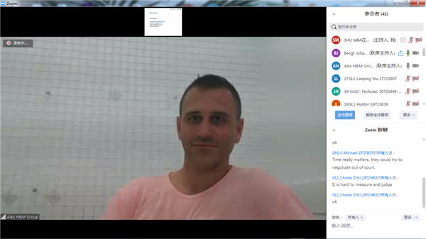 這是我第一次給學(xué)生上網(wǎng)課,感謝前期SHU MBA教務(wù)人員的Zoom培訓(xùn)工作,課堂上操作技術(shù)方面進(jìn)行得非常流暢。同時,使我非常驚訝的是課堂中學(xué)生的組織管理非常好,不管是回答問題、小組討論、演講都和線下課堂十分相近。學(xué)生們的反饋也非常有趣,我會在第二次課程中相應(yīng)增加一些學(xué)生想要了解的瑞典當(dāng)?shù)匕咐齺磉M(jìn)行分析和講解。我非常感謝中心的工作人員在課前、課中和課后提供的教學(xué)和技術(shù)支持。也非常感謝班里每一位同學(xué)的積極參與和互動。