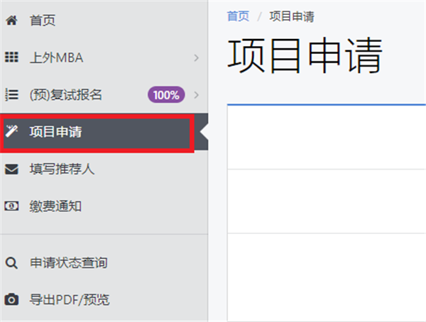 第三步:提交預(yù)復(fù)試申請。所有信息填寫完畢(包括上傳必要文件)后,可以預(yù)覽提交的信息,核驗信息無誤后點擊提交申請。提交后自動進入項目申請頁面(或點擊頁面左邊導(dǎo)航欄進入,如下圖),選擇申請項目和準(zhǔn)備參加的預(yù)復(fù)試時間(系統(tǒng)會自動列出目前可供選擇的申請批次)后,點擊“提交申請”按鈕正式提交申請表,請注意:申請表一旦提交,無法更改。