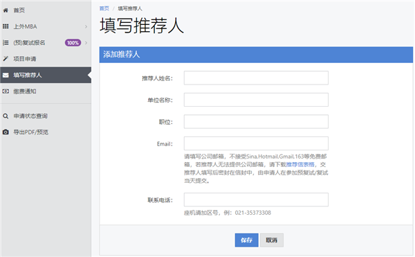 第四步:填寫推薦人信息。點擊頁面左側(cè)導(dǎo)航欄中的“填寫推薦人”,再點擊右側(cè)的“添加推薦人”按鈕填寫保存推薦人信息,并通過右側(cè)“操作”下的按鈕向推薦人發(fā)送邀請,之后推薦人會收到一封帶有鏈接的郵件,點擊鏈接即可在線完成推薦信。注意:邀請一旦發(fā)送,則無法再次修改,但可重新添加。推薦人的郵箱不可以是hotmail、gmail、yahoo、163、qq等免費郵箱。若推薦人只有免費郵箱或一直無法收到邀請郵件,申請者請通過系統(tǒng)下載推薦信表格,交推薦人完成填寫后,將拍照或掃描后的電子版發(fā)送至上外MBA招生辦官方郵箱:admissions.mba@shisu.edu.cn。