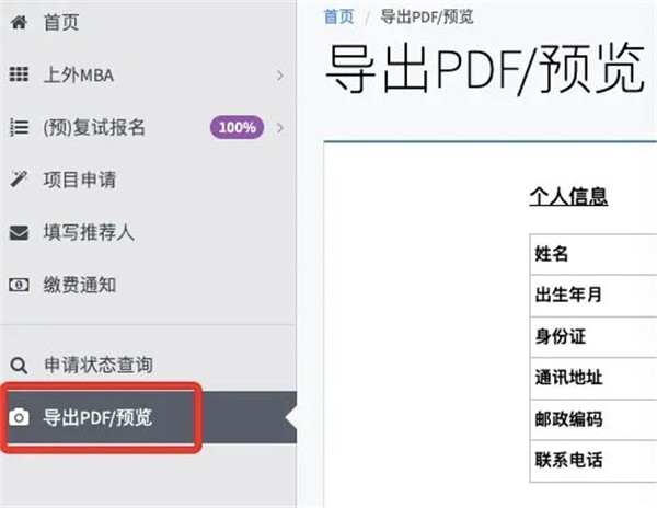 第六步:導(dǎo)出PDF。點擊頁面左側(cè)導(dǎo)航欄中的“導(dǎo)出PDF/預(yù)覽”按鈕,可以瀏覽自己已經(jīng)填寫好的申請表,在申請表的最下方有“導(dǎo)出PDF”按鈕,可以將填寫好的申請表保存成PDF格式文件,請在參加復(fù)試前將導(dǎo)出的PDF申請表發(fā)送給工作人員。