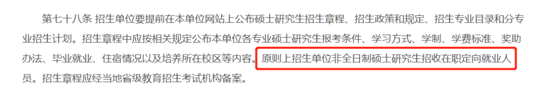 2019年教育部關(guān)于印發(fā)《2020年全國碩士研究生招生工作管理規(guī)定》的通知(教學(xué)函〔2019〕6號)文件里,第78條明確說明:原則上招生單位非全日制碩士研究生招收在職定向就業(yè)人員。
