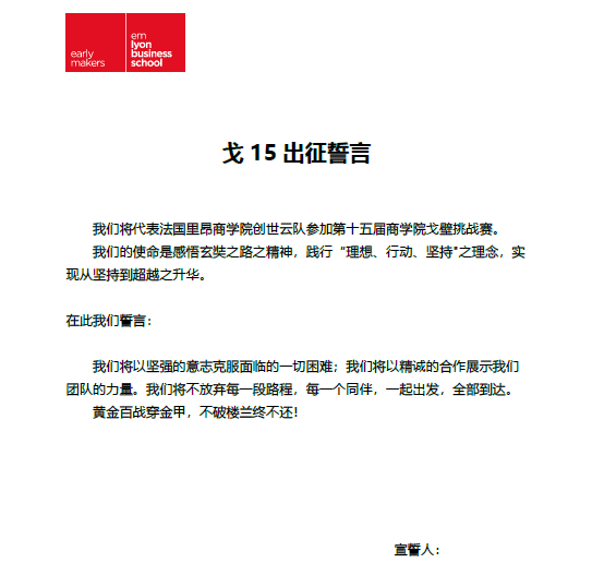 生活總需要一些儀式感,這樣隆重的戈十五出征儀式勢(shì)必邀請(qǐng)到我們最最重量級(jí)的嘉賓來(lái)為我們助陣加油致辭!法國(guó)里昂商學(xué)院亞洲校區(qū)院長(zhǎng)王華教授、EMBA課程蘭賽教授、EMBA項(xiàng)目主任張偉偉老師、EMBA課程李沛話老師、中國(guó)業(yè)余馬拉松頂尖高手李鵬(全馬成績(jī)2小時(shí)21分)等嘉賓親臨現(xiàn)場(chǎng),預(yù)祝法國(guó)里昂商學(xué)院創(chuàng)世云隊(duì)取得最佳成績(jī)。 ▲ 法國(guó)里昂商學(xué)院亞洲校區(qū)校長(zhǎng)王華老師致辭 ▲ 法國(guó)里昂商學(xué)院EMBA項(xiàng)目主任張偉偉老師致辭 ▲ 中國(guó)業(yè)余馬拉松頂尖高手李鵬(全馬成績(jī)2小時(shí)21分)致辭 ▲ 王華校長(zhǎng)為戈十五隊(duì)員授予戈十五隊(duì)旗幟 ▲ 里昂創(chuàng)世云隊(duì)全體宣誓 戈十四、戈十五冠名贊助商-創(chuàng)世云科技