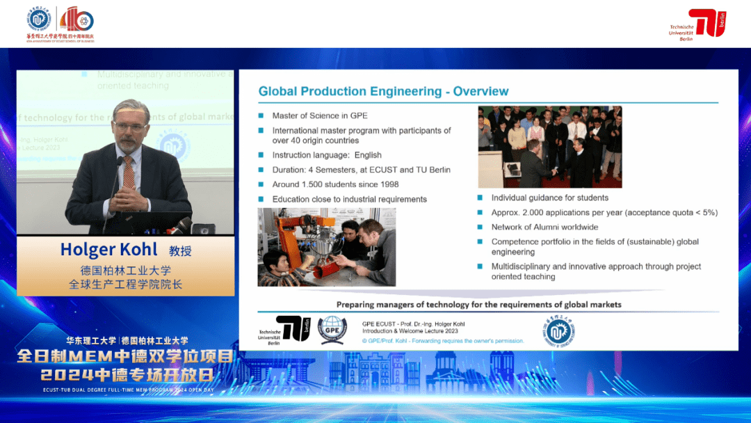 發(fā)布會(huì)伊始,董雙老師對(duì)中德雙學(xué)位MEM項(xiàng)目以及德國(guó)柏林工業(yè)大學(xué)全球生產(chǎn)工程學(xué)院院長(zhǎng)Holger Kohl 進(jìn)行了簡(jiǎn)要介紹。她提到,融合德國(guó)柏林工業(yè)大學(xué)全球生產(chǎn)工程碩士與華東理工大學(xué)工程管理碩士?jī)?yōu)勢(shì)課程開(kāi)設(shè)的雙學(xué)位工程管理碩士項(xiàng)目,擁有融貫中西學(xué)術(shù)造詣深厚、教學(xué)經(jīng)驗(yàn)豐富的師資團(tuán)隊(duì),課程體系兼具特色化、創(chuàng)新性、精細(xì)化與專(zhuān)業(yè)化,能有效培養(yǎng)學(xué)生將專(zhuān)業(yè)理論知識(shí)應(yīng)用于解決實(shí)際問(wèn)題的能力以及創(chuàng)新創(chuàng)業(yè)的能力。