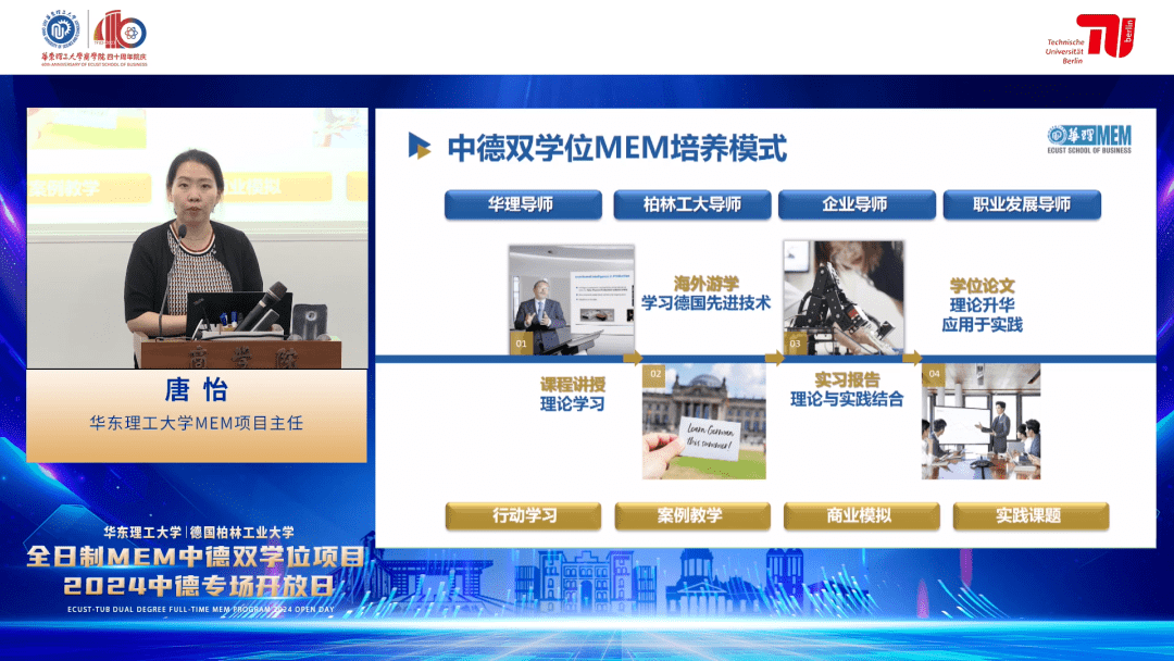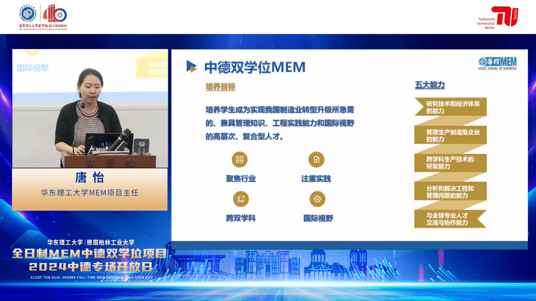 華東理工大學(xué)MEM項(xiàng)目主任唐怡老師圍繞項(xiàng)目設(shè)立背景、師資力量、課程體系、培養(yǎng)特色等內(nèi)容對(duì)中德雙學(xué)位MEM項(xiàng)目進(jìn)行了全方位解讀。她表示,華理中德雙學(xué)位MEM是融合德國(guó)柏林工業(yè)大學(xué)全球生產(chǎn)工程理學(xué)碩士與華東理工大學(xué)工程管理碩士?jī)?yōu)勢(shì)課程的雙學(xué)位碩士項(xiàng)目,是國(guó)內(nèi)稀缺的管理+工程跨學(xué)科雙學(xué)位碩士,被譽(yù)為“制造業(yè)的MBA”。項(xiàng)目引入德國(guó)先進(jìn)理論知識(shí)和教學(xué)方法,致力于培養(yǎng)學(xué)生成為實(shí)現(xiàn)我國(guó)制造業(yè)轉(zhuǎn)型升級(jí)所急需的、兼具管理知識(shí)、工程實(shí)踐能力和國(guó)際視野的高層次、復(fù)合型人才。