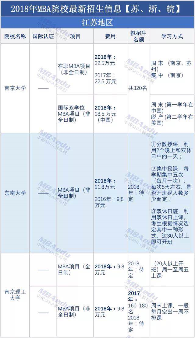 【中國MBA教育網整合】距離2018年MBA聯考還有60多天,你備考的怎么樣了?MBA備考實際是一場信息戰(zhàn),除了高效利用時間進行復習,你還要去了解MBA項目的招生人數、學習方式、費用信息,畢竟知己知彼,才能百戰(zhàn)不殆!今天小編給大家整理了最新的蘇、浙、皖地區(qū)的MBA項目信息,來看看你報考的MBA項目競爭壓力如何,一起了解它們的招生人數!