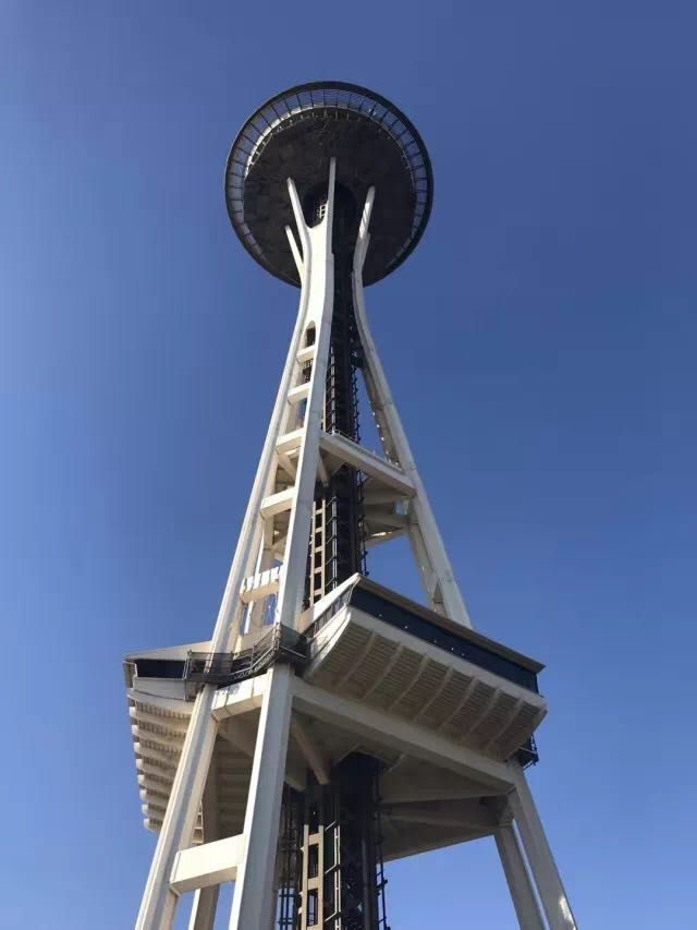 而這一切都能在太空針?biāo)希╊珶o疑。天空針?biāo)俏餮艌D的地標(biāo)建筑,是這個城市的代表。離地面五百二十英尺左右的瞭望臺,帶我們一行,盡瞰西雅圖的整個風(fēng)貌。