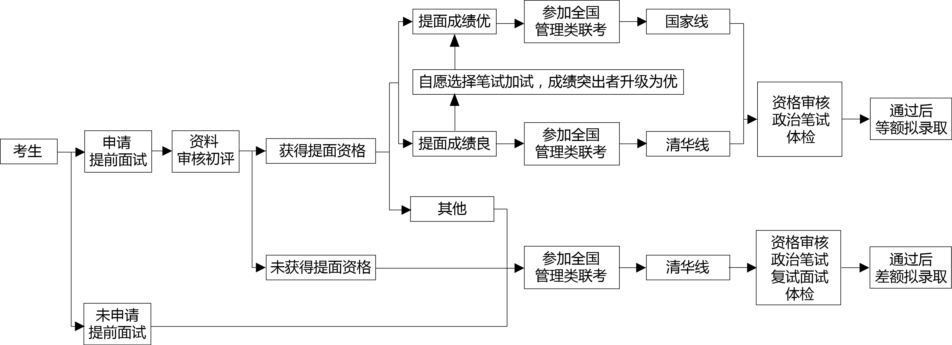 在提前面試中得到成績“優(yōu)”或“良”的考生在全國聯(lián)考中分別通過“國家線”或“清華線”可獲得復(fù)試資格。通過復(fù)試,體檢合格的考生將被等額推薦到學(xué)校招生部門進(jìn)行后續(xù)審核和錄取工作。