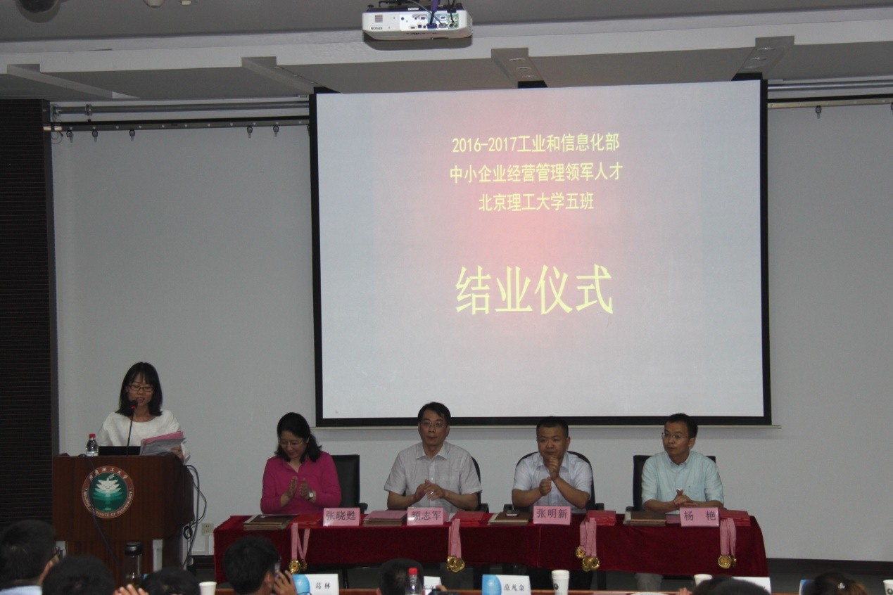 2018年5月12日,工信部中小企業(yè)經(jīng)營管理領軍人才-北京理工大學領軍五班結業(yè)儀式在我校研究生樓102教室隆重舉行。河南省工信委中小企業(yè)服務局企業(yè)處處長張明新、北京理工大學管理與經(jīng)濟學院副院長顏志軍、專業(yè)學位教育聯(lián)合中心副主任兼EDP項目主任楊艷、專業(yè)學位教育聯(lián)合中心副主任張曉甦以及來自河南和山西兩省的領軍企業(yè)家學員們共同出席了結業(yè)儀式。結業(yè)儀式由專業(yè)學位教育聯(lián)合中心EDP項目-領軍人才專職班主任李妍主持。