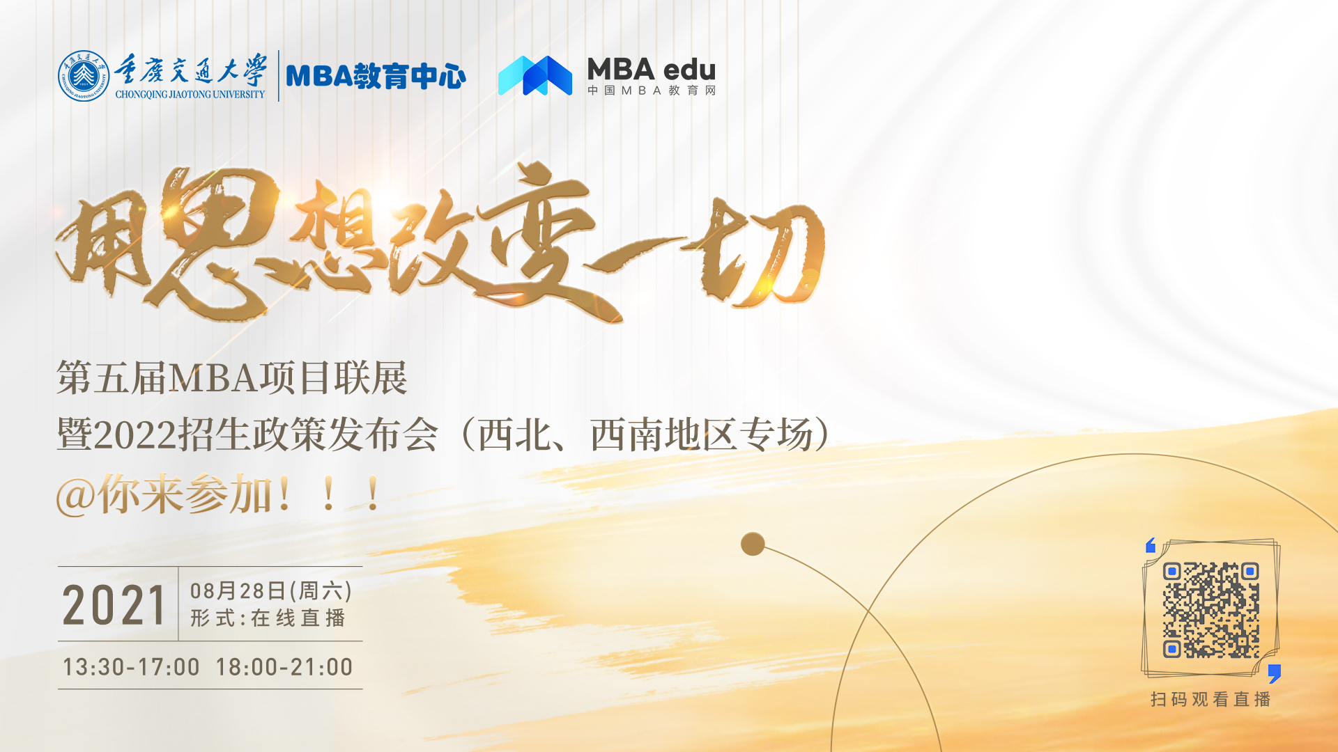 同時,為積極響應(yīng)國家倡議,做好暑假期間疫情安全防控——中國MBA教育網(wǎng)將采用線上直播的方式,8月28日,重慶交通大學(xué)MBA教育中心招生主管王錦輝老師應(yīng)邀參加第五屆MBA項目聯(lián)展暨2022在線招生政策發(fā)布會(西北、西南地區(qū)專場)”,助力考生在抗“疫”行動中,提前了解院校招生動態(tài)、項目特色、報考與錄取等相關(guān)信息,歡迎廣大考生報名,線上咨詢重慶交通大學(xué)MBA項目。