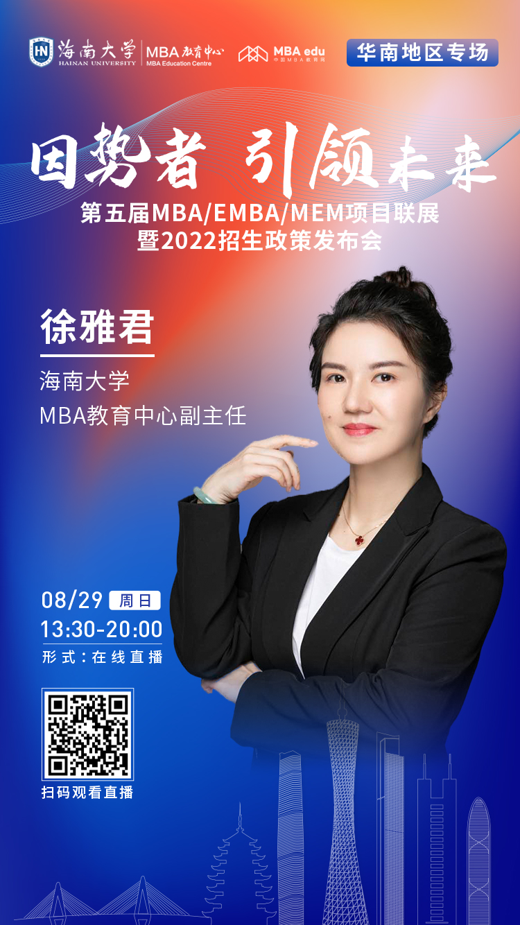 為幫助考生更全面、更及時地了解海南大學(xué)MBA項目資訊,掌握最新報考信息,8月29日,海大MBA應(yīng)邀參加由中國MBA教育網(wǎng)在線舉辦的“第五屆MBA/EMBA/MEM項目聯(lián)展暨2022招生政策發(fā)布會(華南地區(qū)專場)”。歡迎廣大考生報名觀看,在線咨詢海南大學(xué)MBA項目!