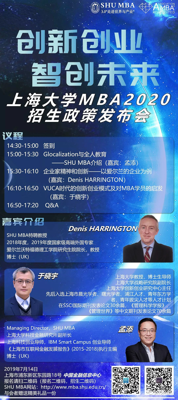 Right program Right student 上海大學(xué)MBA創(chuàng)辦15周年以來 一直堅(jiān)持培養(yǎng)全面發(fā)展、 可相信與可共事的Global Local 人才 一流師資隊(duì)伍 360度國際交流機(jī)會(huì) 2000+社企資源 精準(zhǔn)項(xiàng)目定位 超高性價(jià)比 正在等待合適的你 7月14日 上海市浦東新區(qū)東園路18號(hào) 中國金融信息中心 上海大學(xué)MBA2020招生政策發(fā)布會(huì): 上海大學(xué)MBA最新招生政策 詳細(xì)項(xiàng)目介紹與報(bào)考流程 創(chuàng)新創(chuàng)業(yè)名師指導(dǎo) 等你來參加! 報(bào)名請(qǐng)掃下方二維碼 (與會(huì)者贈(zèng)送精美禮品一份~~) 議程 時(shí)間:7月14日14:30-17:20 地點(diǎn):上海市浦東新區(qū)東園路18號(hào)中國金融信息中心