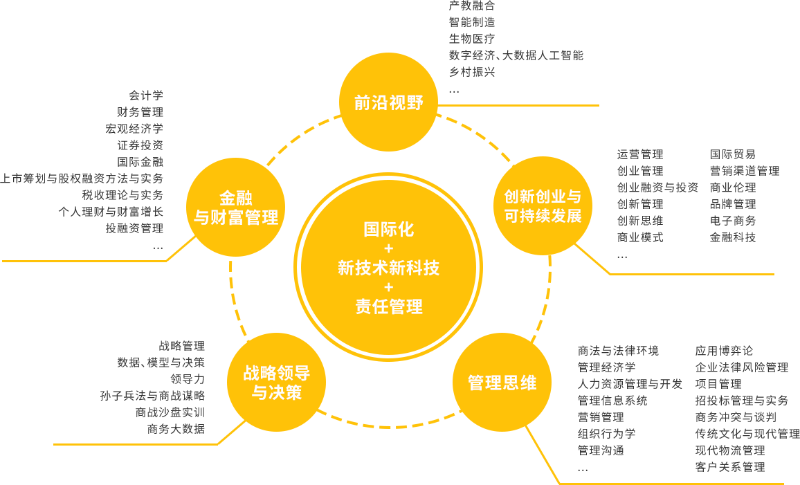 培養(yǎng)具有國際視野、戰(zhàn)略眼光、全局觀念和前沿視野,具備在復(fù)雜的國內(nèi)外經(jīng)濟(jì)、社會和技術(shù)環(huán)境下制定企業(yè)發(fā)展戰(zhàn)略、進(jìn)行企業(yè)日常經(jīng)營管理決策、領(lǐng)導(dǎo)企業(yè)參與國內(nèi)外競爭的能力和知識的卓越領(lǐng)袖。